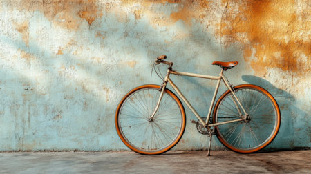 A classic bicycle rests against a textured brick wall in an outdoor setting, likely a street or public space. The image displays a vintage aesthetic with metal frame and leather seat. Soft sunlight bathes the scene, highlighting the details. Suitable for commercial projects or editorial use.