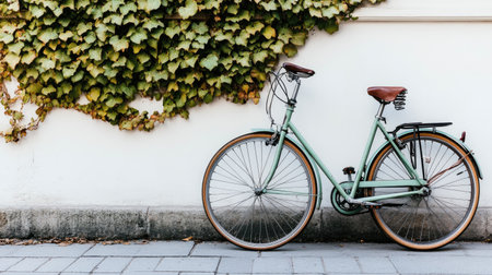 Photo of a pastel green bicycle with ivy on the wall behind it, against an off-white background. Web banner with copy space on the right. --chaos 30 --ar 16:9 --v 6.1 Job ID: 1afb9c92-1fc6-4293-b394-385a98724773