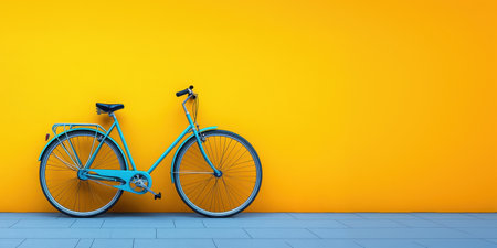 This striking visual features a blue bicycle positioned next to a vibrant yellow wall. The minimalist design highlights intricate details under studio lighting, creating a sharp and clean appearance.