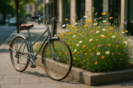 Classic bicycle parked near a vibrant flowerbed on a city sidewalk, representing urban sustainability and eco friendly transportation
