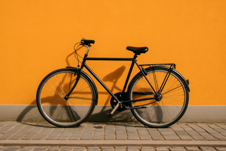 A black bicycle rests against a bright orange wall in a sunny setting