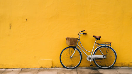 Vintage bicycle in front of yellow wall with space for text.