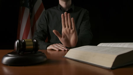 Male sitting at the desk with wooden hammer and law book, USA flag at the background. Man judge in the court room shows stop gesture.