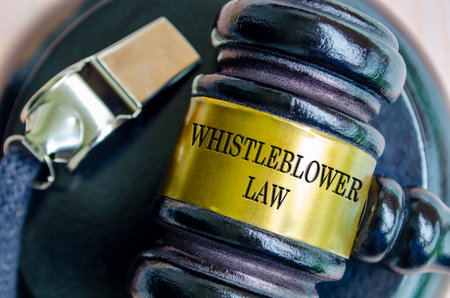 Whistleblower Law text engraved on Lawyer Gavel. Whistleblowing concept.