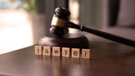 Small hammer gavel on the desk in the lawyer's room, using the law to judge with fairness and justice, defending the lawyer's case against the client. Concept of law and justice.