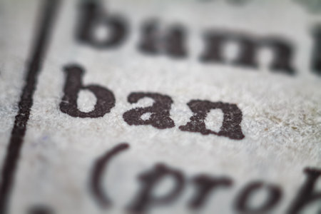 Close-up macro of the word ban in the dictionary illustrating the concept of access restriction and rules of conduct on the Internet, close-up.