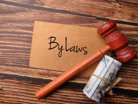 Bylaws phrase with gavel on wooden background. Business and law concept