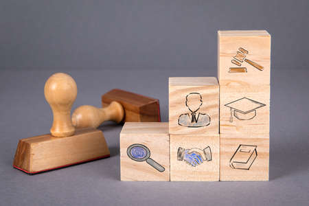 Law, Justice, Judgment and Reconciliation concept. Stamps and wooden blocks on a gray background