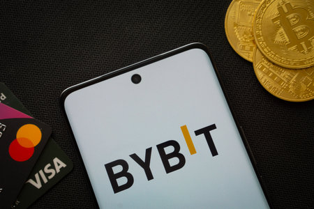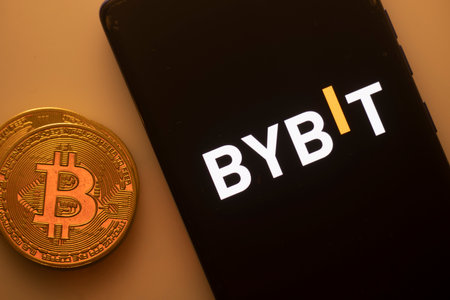 Vigo, Spain, November 30, 2025.A human hand holds a smartphone whose screen displays the logo of Bybit, a Singapore-based centralized exchange specializing in cryptocurrency derivatives. The black background and minimalist design reinforce the technologic