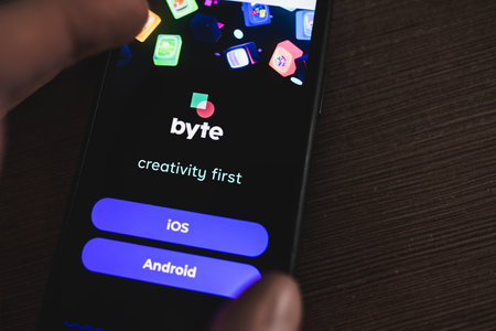 Dhaka, Bangladesh- 29 May 2025: On a blue surface, a smartphone displays the Bybit app within the Google Play Store.