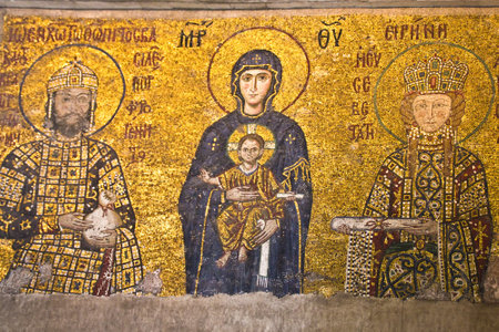 ISTANBUL, TURKEY - OCTOBER 30, 2015: Emperor John II Comnenus, Virgin Mary with Jesus and Empress Irene - Byzantine mosaic in Hagia Sophia Dome. The Comnenus mosaic dates from 1122