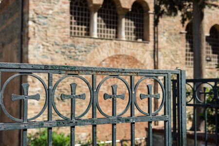 Iron metal fence with christian orthodox crosses cross in front of ancient church in sunny day