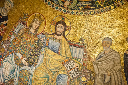 Old mosaic Coronation of the Virgin from main Apse of Santa Maria in Trastevere church,