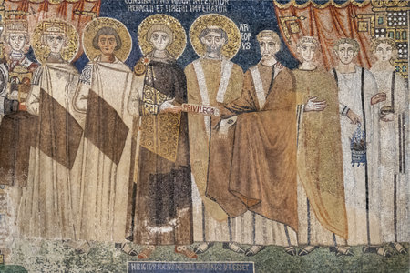 Ravenna, Italy - 01.11.2021 - Famous Early Christian Mosaics at San Vitale Church in Ravenna - Byzantine mosaic of Emperor Justinian and his retinue, Emilia Romagna, Italy, Europe