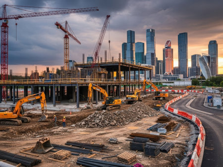 A bustling construction site featuring various heavy machinery and cranes, with a backdrop of modern skyscrapers.