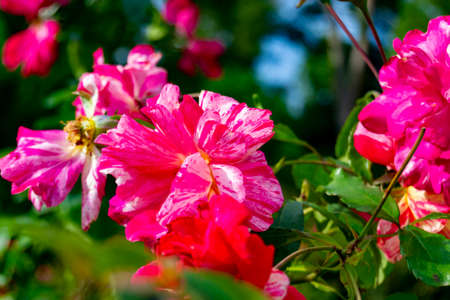 Roses on green blurred background with red petals. Blooming pink rose in the garden. Selective focus