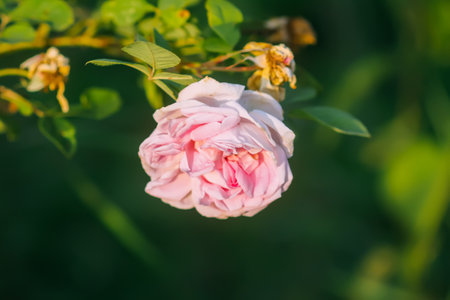 Alone pastel pink fragrant rose in a dark garden. Rosebud on a flowering shrub in summer day. Gardening, horticulture, floriculture, plants and flowers grow and care. Beautiful floral wallpaper.