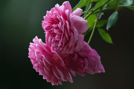 Beautiful pink rose in the garden on a dark background. Selective focus.