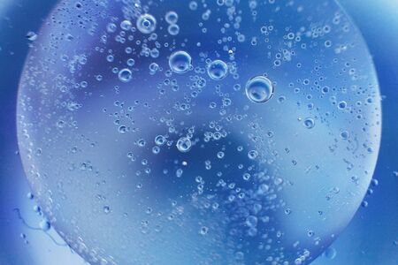 macro of transparent blue liquid with bubbles, abstract background