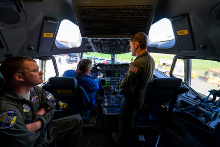 BERLIN - APRIL 27, 2018: Cockpit of strategic and tactical airlifter Boeing C-17 Globemaster III. Exhibition ILA Berlin Air Show 2018