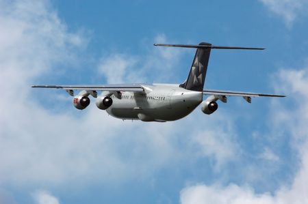 Large four engine jet transport aircraft flying high in the clear blue sky with white clouds