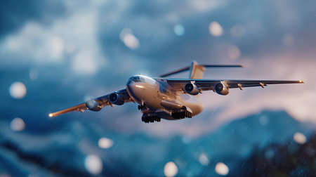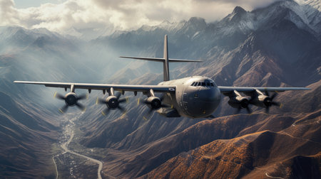 A cargo plane soaring above mountains photo realistic - Generative AI.