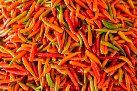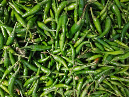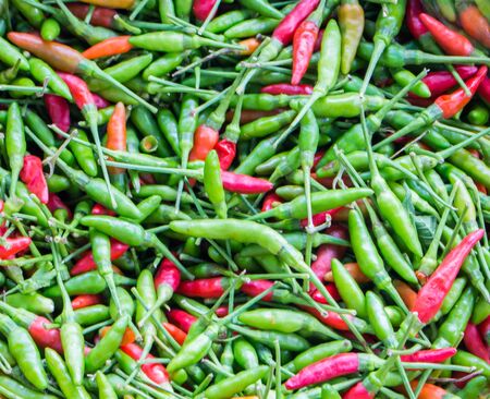 Heap of fresh spicy red and green chillies.