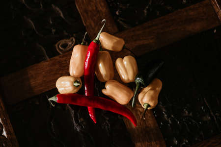 Some red spicy chili peppers on wooden table