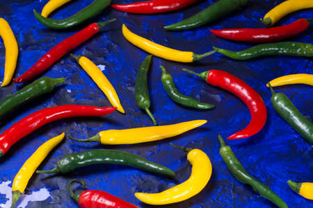 Red, green and yellow mexican hot chili peppers top view