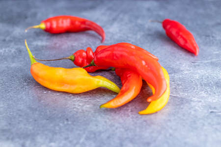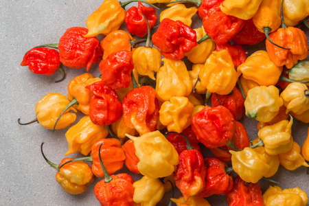 Many pods of the world's hottest red and yellow California Reaper pepper are lying on a gray stone. Flatley. Selective focus