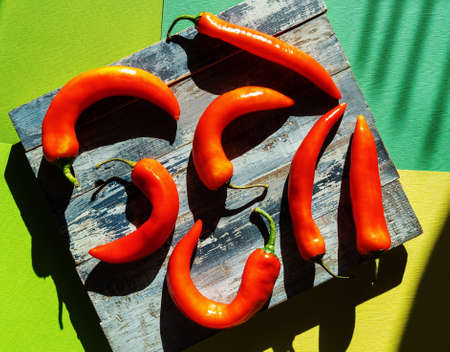 Red Hot Chili Peppers On Background or White Table. A Lot of Red Chilli Peppers. Green, Yellow Hot Chili Peppers. Copy space for your text. Flat lay, top view. Colorful chili pepper rainbow. Gradient.