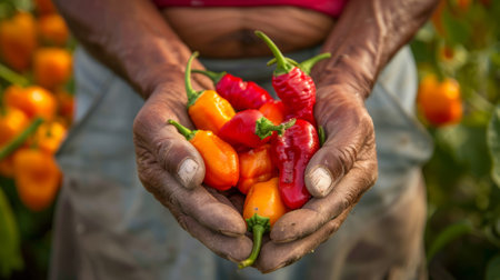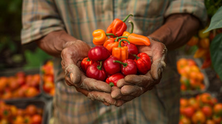 farmer holding red chili peppers and orange habaneros generative ai