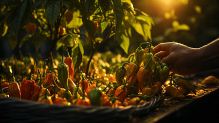 Person picking up chilies on a garden. Generative AI.