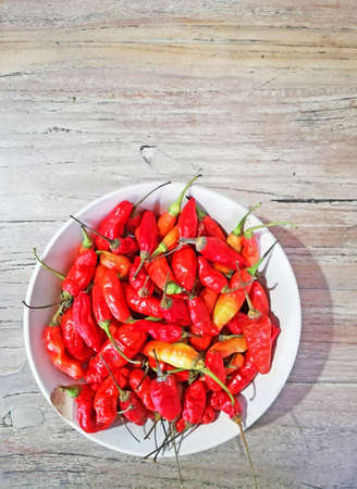 Red chili pepper placed on white bowl,on brown wooden backgrond