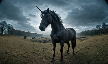 A black unicorn stands in a field, looking towards the left, with a forest and cloudy sky in the background