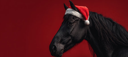 Close-up of a black horse wearing a Santa hat, captured with dramatic studio lighting against a plain red background. The minimal yet striking composition creates a festive holiday aesthetic.