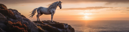 A white horse standing on top of a cliff. Generative AI image.