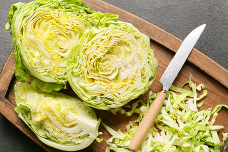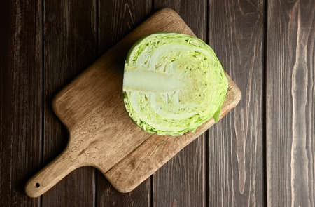 Half a head of fresh white cabbage on wooden cutting board over dark wooden table background, top view, copy space