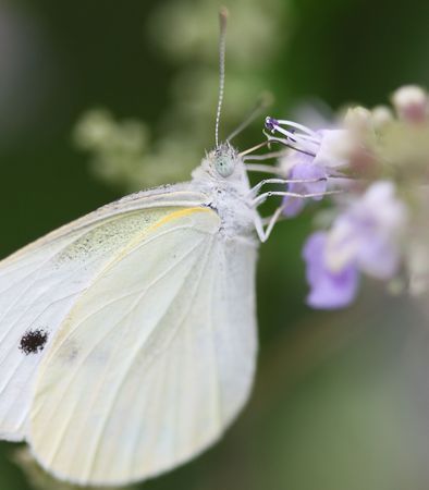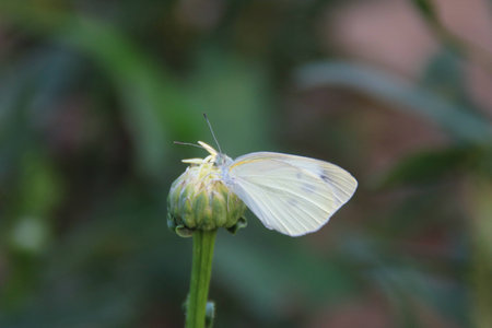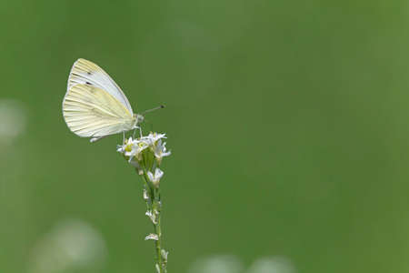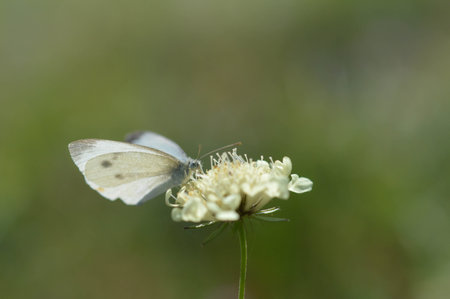 Small white, cabbage white on a white pincushion flower, white butterfly on a white wild flower, green background.