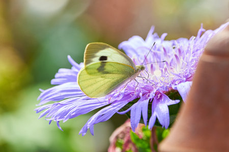 Beautiful yellow butterfly collects nectar on a bud of Astra Verghinas