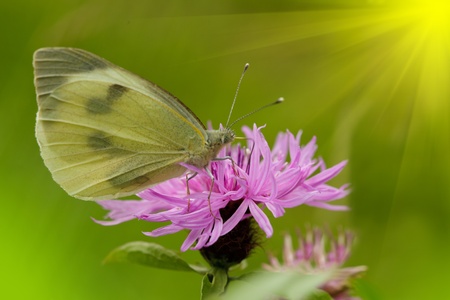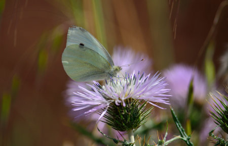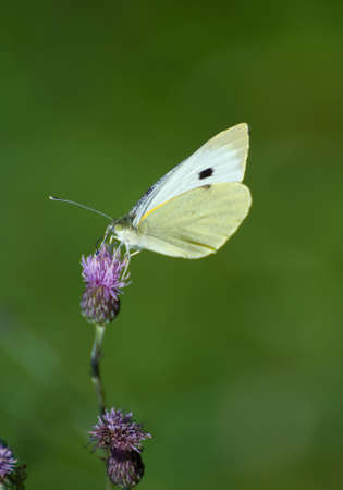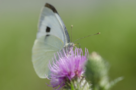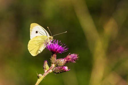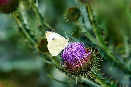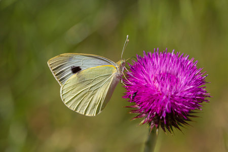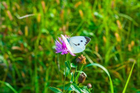 cabbage white butterfly on purple flower thistle ruffled in summer, Poland