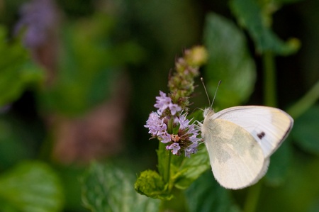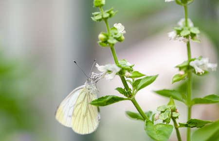 Large Cabbage White butterfly on mint against a green natural background. High quality photo