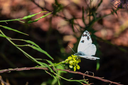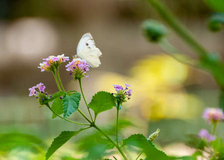 Selective focus on beautiful small white cabbage butterfly (Pieris rapae) on a flower feeding on nectar against blurred background. Garajonay National Park, La Gomera, Canary Islands, Spain, Europe