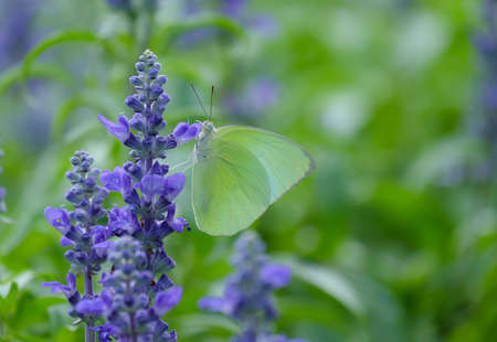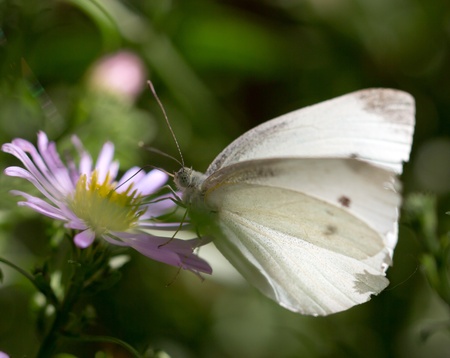 A closeup shot of a wonderful white butterfly sitting on a purple flower