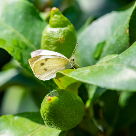 small white, Pieris rapae, white and yellow butterfly perched on a lemon tree