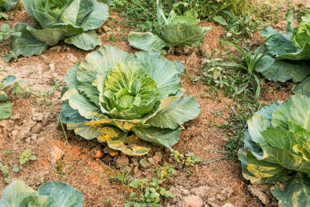 Organic cabbage vegetable food in field garden. Cabbage or headed cabbage is a leafy green and biennial plant grown as an annual vegetable.