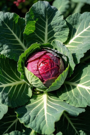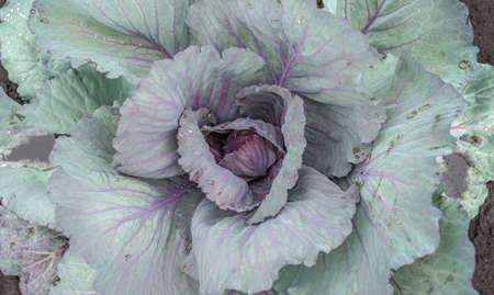 Purple cabbage growing in the garden. Close up of cabbage head.