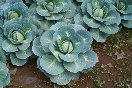 Lush garden embraces bright, leafy cabbages with richly textured foliage, symbolizing healthy growth and vibrant greenery in an outdoor vegetable patch.