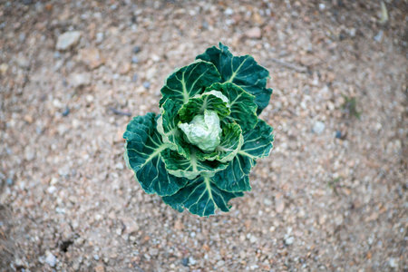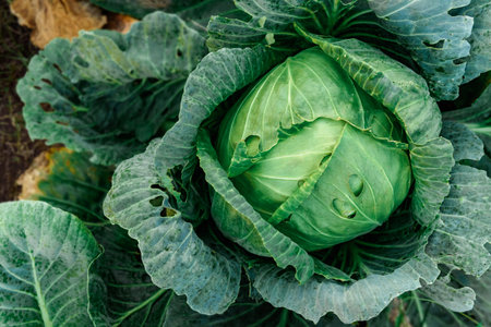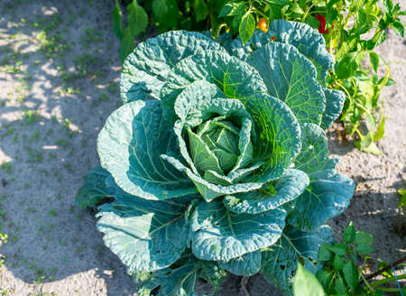 Ripe natural cabbage growing in garden. Concept agriculture. Top view.