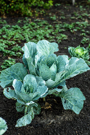 Ripe cabbage growing in soil in summer garden. Harvest fresh cabbage
